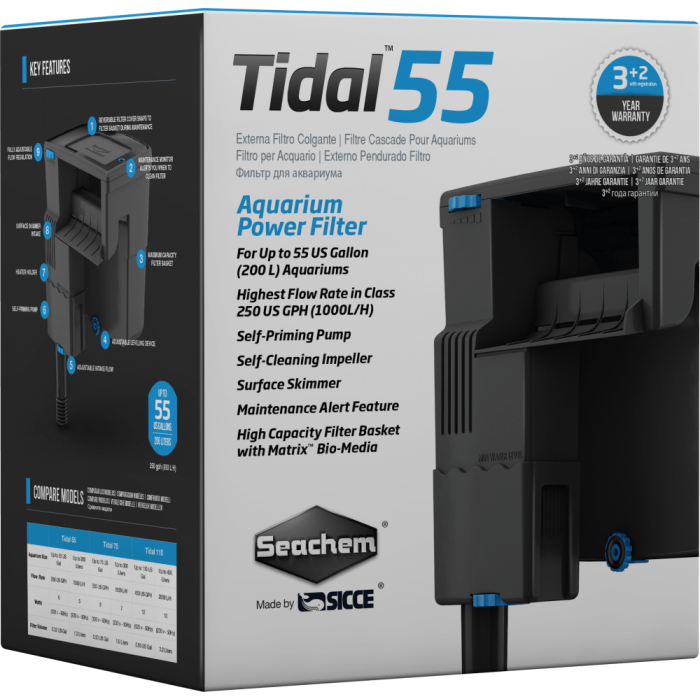 Tidal™ Power Filters are designed from the ground up to provide your aquarium with high-quality, comprehensive filtration. They are easy to use and adaptable to a variety of aquarium conditions. With a host of features including a self-priming pump, dual water intake with surface skimmer, adjustable flow, maintenance monitor, self-cleaning impeller, and a filter basket that holds any kind of filtration media - and more of it - Tidal™ Power Filters are designed to deliver the highest water quality possible with maximum versatility and ease of use. They are suited to a wide variety of aquarium setups from saltwater to freshwater, ranging in size from 55 gallons to 110 gallons. All Tidal™ Filters have a 3 year warranty that can be extended to 5 years by registering your filter.