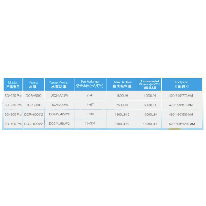 (SD-220 Pro)Pump Power:DC24V,42WDCR-6000 PumpFlow Rate:6000L/HMax Air Intake: 1800L/HHanding Copacity:4200L/HTank Volume:2-4吨Size:400*340*770mmWarrant..