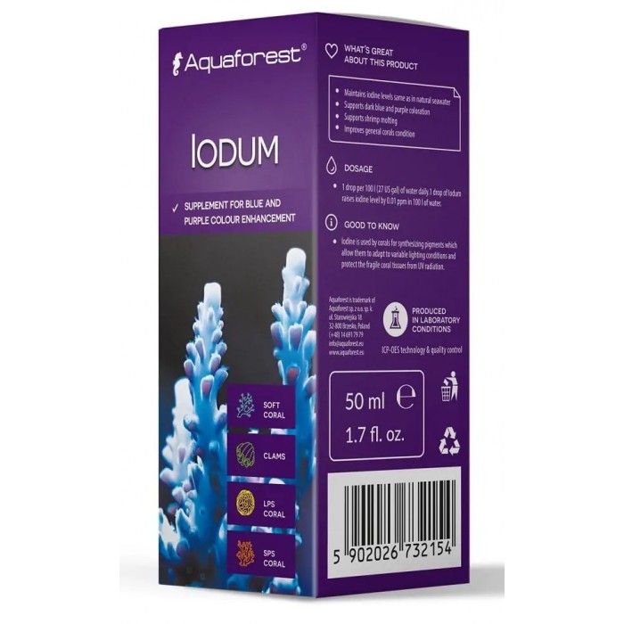 Aquaforest Iodum is used for synthesising corals. This also helps with pigments and can intensify blue and purple coloration.Aquaforest IodumSupplemen..