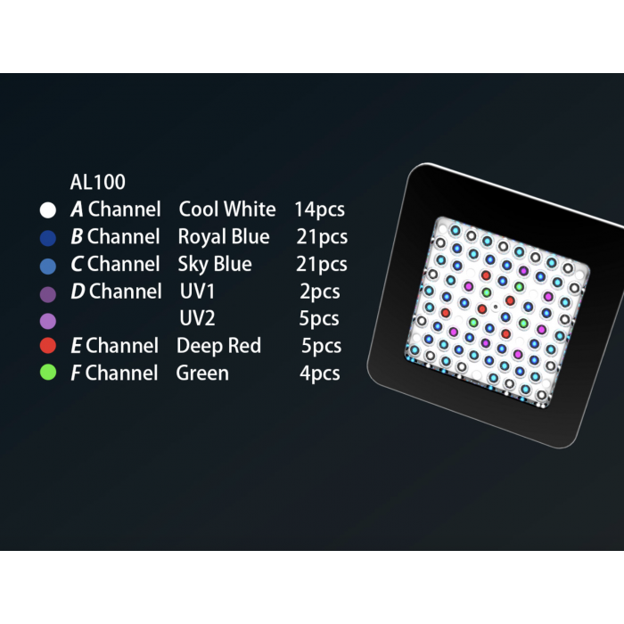 Channel A is cool white, B is royal blue, C is sky blue, D is UV 1 and UV 2, E is deep red, and F is green. The AL200 and 150 models have a total of 224 and 144 diodes, respectively.