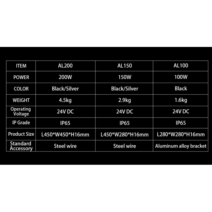 The AL200 measures 450 x 450 x 16 mm and weighs 4.5 kg. The AL150 measures 460 x280 x 16 mm and weighs 2.9 kg. Both models are available in black or silver and can be ceiling-mounted or tank-mounted. Tank-mount options are rare for large light panels, which enhances their sleek design from the outset.
